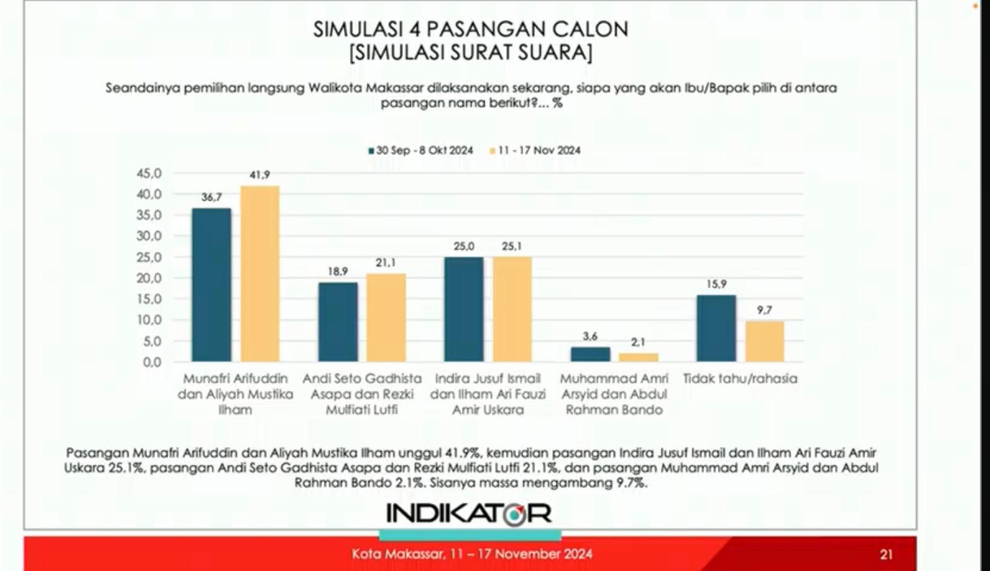 Berdasarkan survei LSI Denny JA, paslon nomor urut 1, Munafri Arifudin – Aliyah Mustika Ilham (MULIA) memimpin dengan elektabilitas 34,6%. Sementara menurut Indikator Politik Indonesia, elektabilitas MULIA ada di angka 41,9 persen atau naik cukup signifikan dibandingkan rilis survei mereka September lalu yakni 36,7 persen.