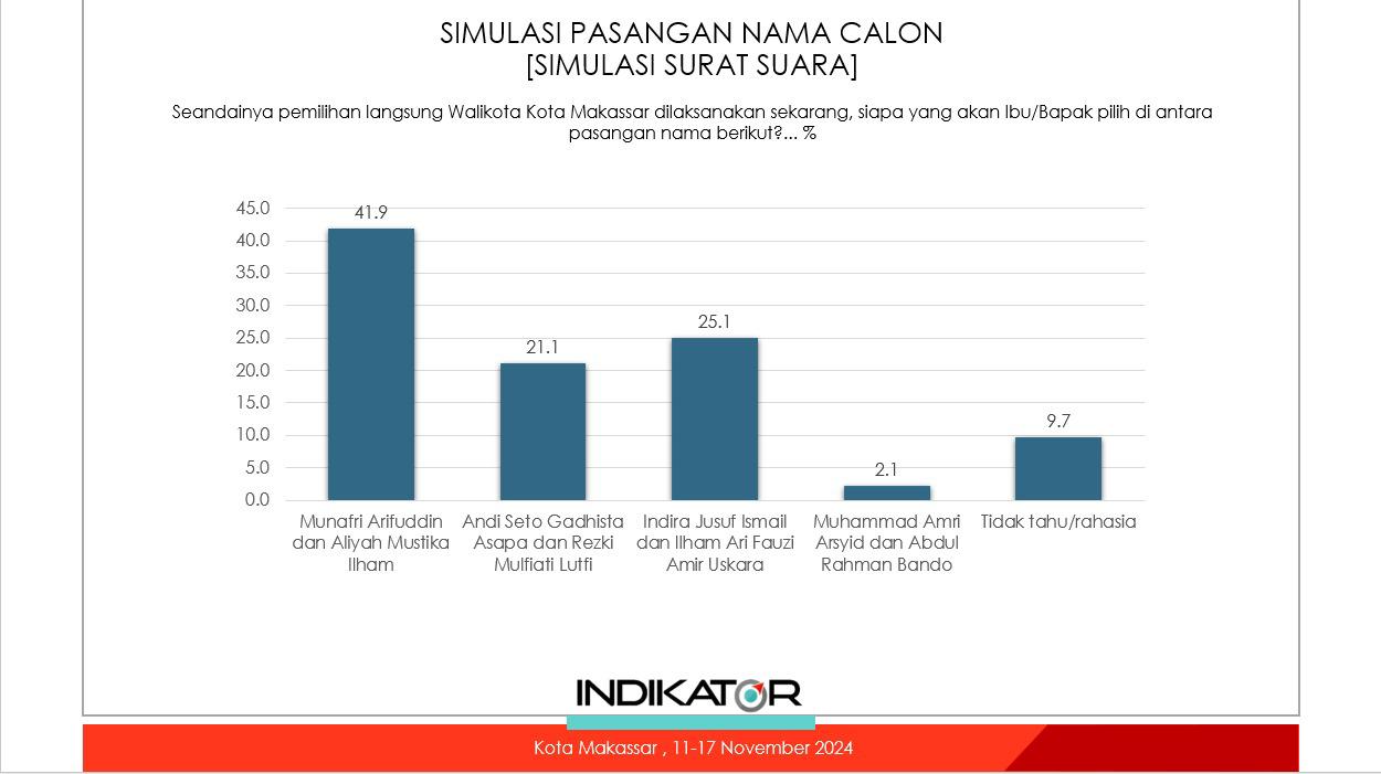 Survei ini dilaksanakan mulai 11 sampai 17 November. Hasilnya, elektabilitas pasangan Munafri Arifuddin- Aliyah Mustika Ilham.(MULIA) tetap kokoh di puncak dengan 41,9 persen.