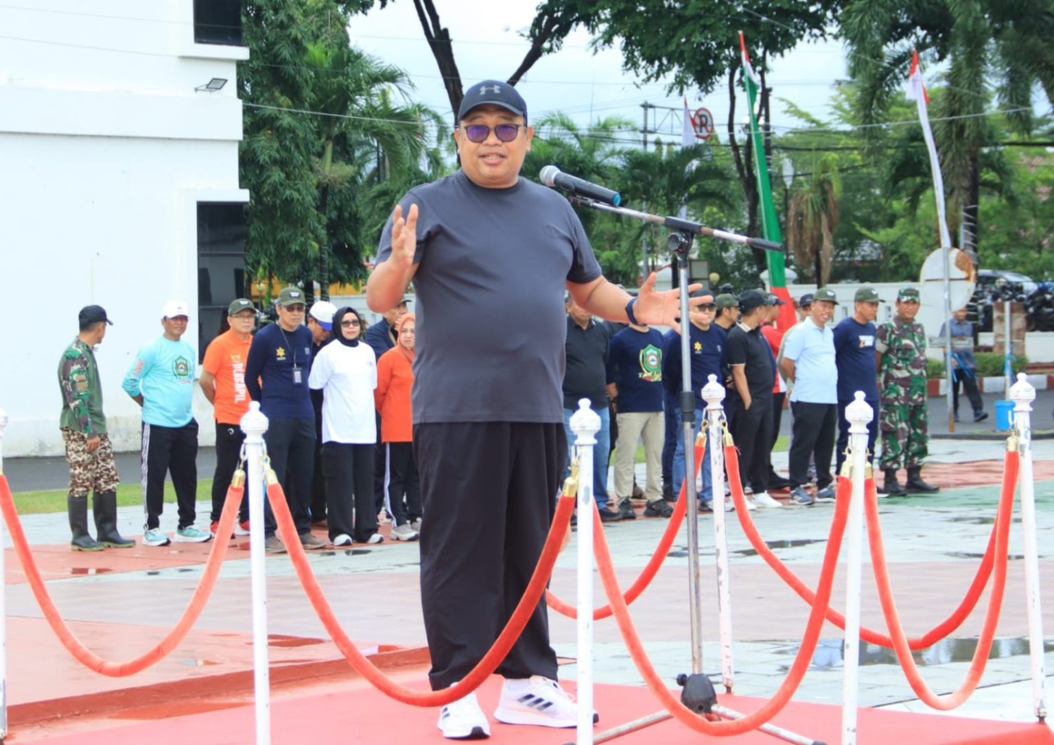 Bupati Takalar Daeng Manye hadir lebih awal, sekitar 30 menit sebelum kegiatan dimulai. Mengenakan kaos abu-abu, celana training hitam, topi hitam, dan sepatu kets putih, ia tampil sederhana sesuai konsep apel kebersihan yang dikemas dengan nuansa olahraga.