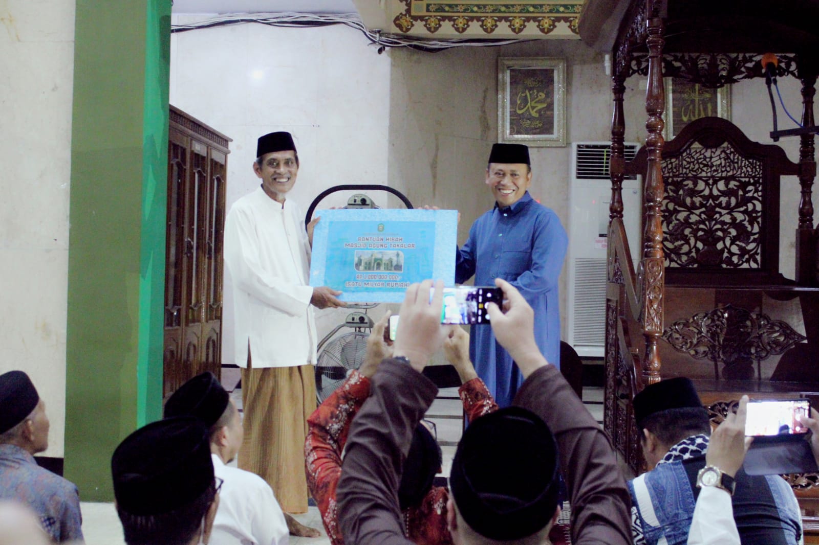 MANIFESTO, TAKALAR- Bupati Takalar Syamsari memberikan dana hibah sebesar Rp1 Miliar sebelum membawakan ceramah agama pada tarwih pertama ramadan di Masjid Agung Takalar, Sabtu (2/4/2022) malam.