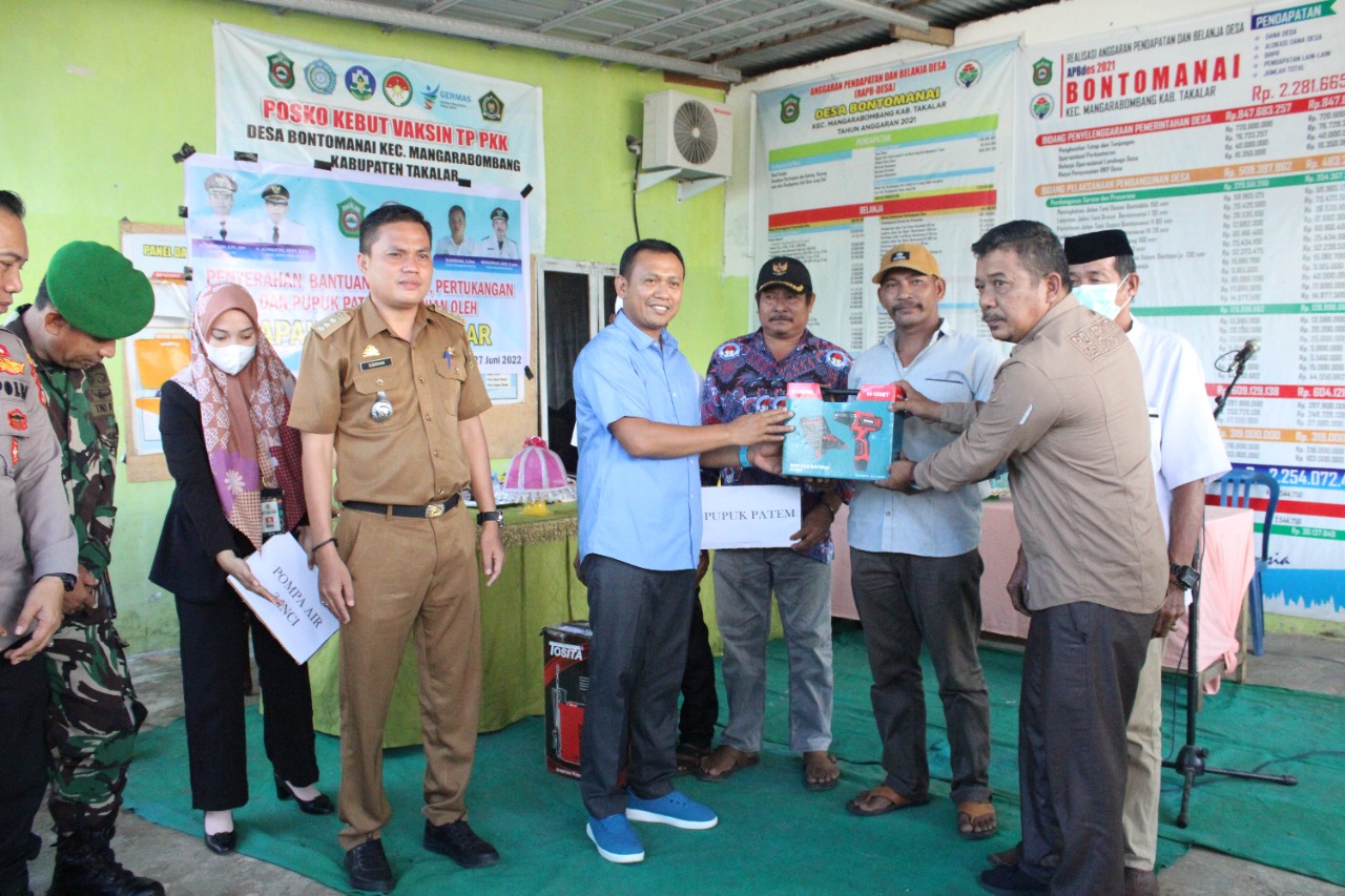 MANIFESTO, TAKALAR- Bupati Takalar Syamsari menyerahkan bantuan pada dua desa di Kecamatan Mangarabombang, Senin (27/6/2022) siang.