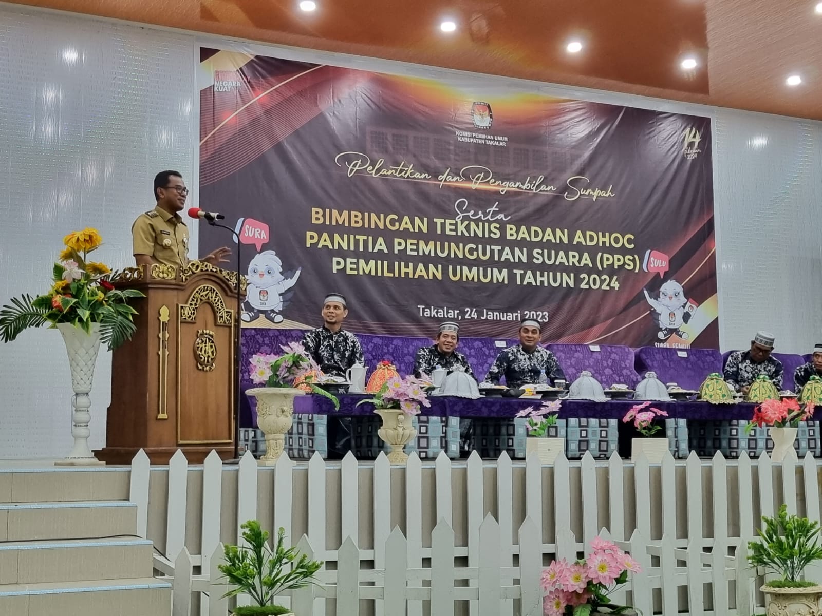 MANIFESTO, TAKALAR- Penjabat Bupati Takalar Dr. Setiawan Aswad, menghadiri acara pelantikan dan pengambilan sumpah serta bimbingan teknis Panitia Pemungutan Suara (PPS) Pemilihan Umum tahun 2024 di Aula Wisata Pantai Topejawa, kecamatan Mangarabombang, Selasa 24/01/2023.