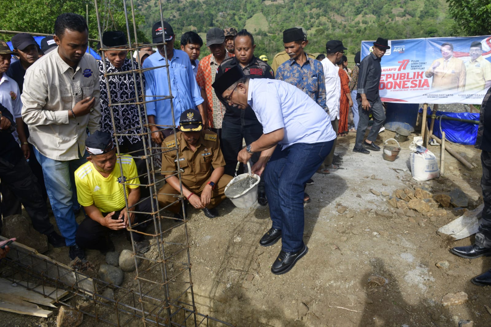 Peletakan batu pertama di wilayah terpencil Jeneponto itu dipenuhi dengan spanduk ucapan HUT RI Airlangga Hartarto dan IAS. Menjadi perhatian publik mengingat Kecamatan Bangkala adalah wilayah di mana Golkar jarang menang di berbagai kontestasi politik.