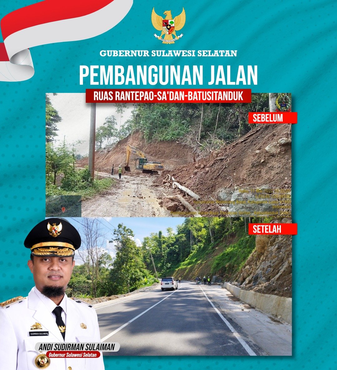 “Alhamdulillah, telah tuntas 100 persen pengerjaan jalan ruas Rantepao – Sa’dan – Batusitanduk sepanjang 5,4 km untuk pengerjaan tahun 2022 dengan konstruksi jalan aspal plus bahu beton,” kata Gubernur Sulawesi Selatan, Andi Sudirman Sulaiman, Minggu, 8 Januari 2023.