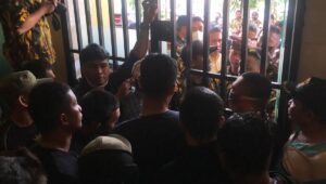 Massa yang diduga orang- orang Ketua Harian Golkar Sulsel Kadir Halid mencoba memaksa masuk ke kantor DPD I Partai Golkar Sulsel, Kamis 21 Juli 2022. (Ist)