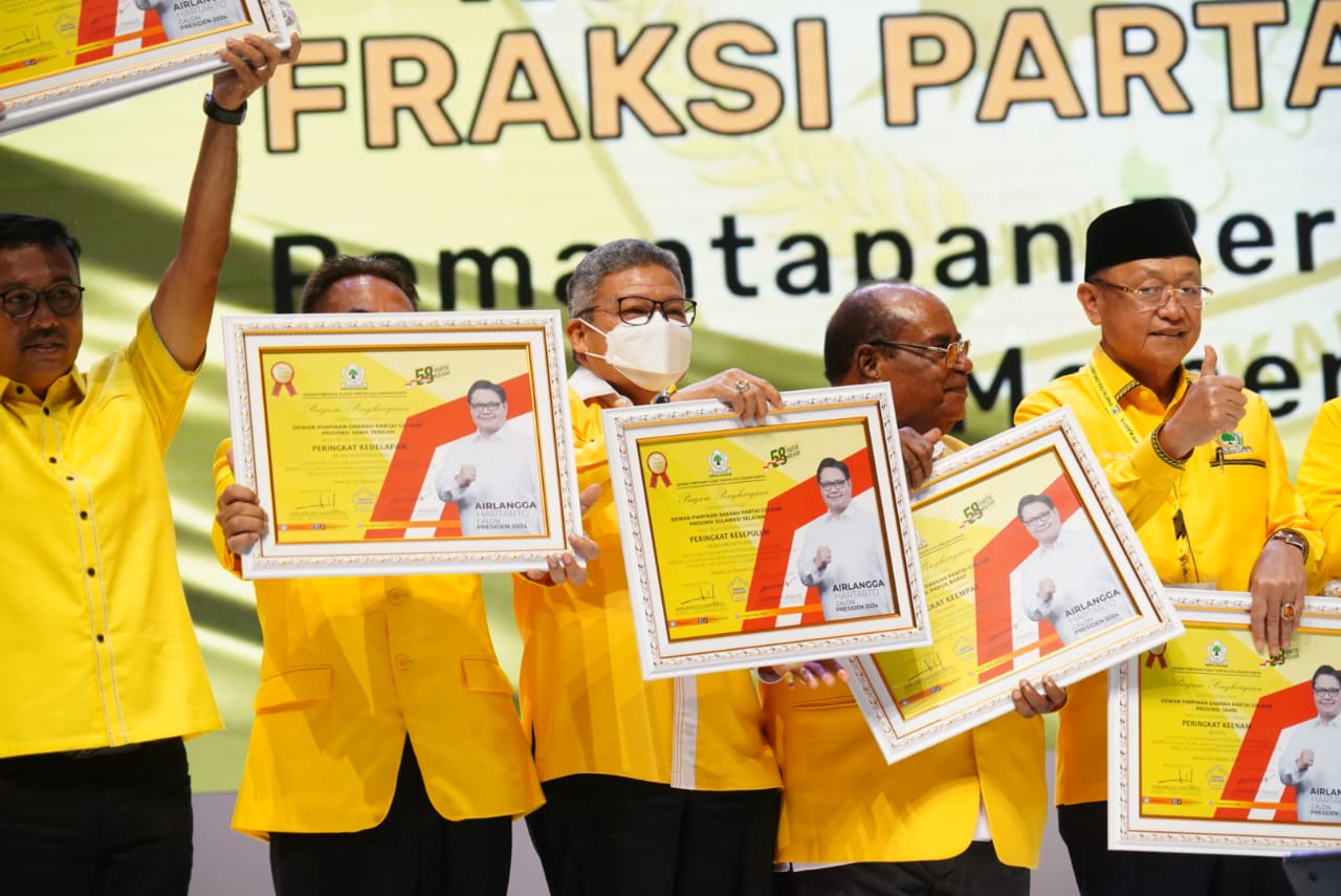 Sementara Ketua Umum DPP Partai Golkar Airlangga Hartarto mengapresasi para ketua DPD I dan DPD II atas penghargaan yang diraih.