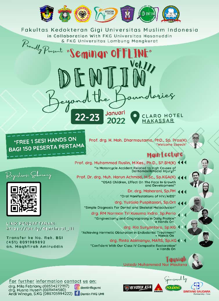 MANIFESTO, MAKASSAR– Fakultas Kedokteran Gigi (FKG) Universitas Muslim Indonesia (UMI) berkolaborasi dengan FKG Universitas Hasanuddin dan FKG Universitas Lambung Mangkurat akan menyelenggarakan seminar nasional kedokteran gigi bertajuk Dentin Vol III yang mengusung tema “Beyond the Bounderies”.