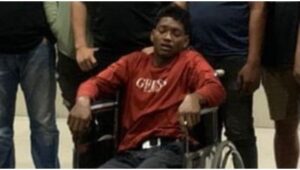 Dari foto yang beredar, nampak terduga pelaku duduk di atas kursi roda dengan kaki kanan dibalut perban. Beredar informasi, pelaku ditembak saat mencoba untuk kabur.
