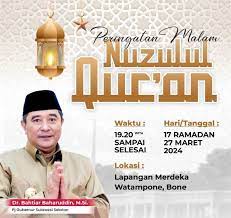 MANIFESTO, BONE – Peringatan Nuzulul Qur’an pada 17 Ramadan 1445 Hijriah Tingkat Provinsi Sulawesi Selatan dipusatkan di Kabupaten Bone, 27 Maret 2024. Pelaksanaannya dilaksanakan di Lapangan Merdeka dan Rumah Jabatan Bupati Bone.