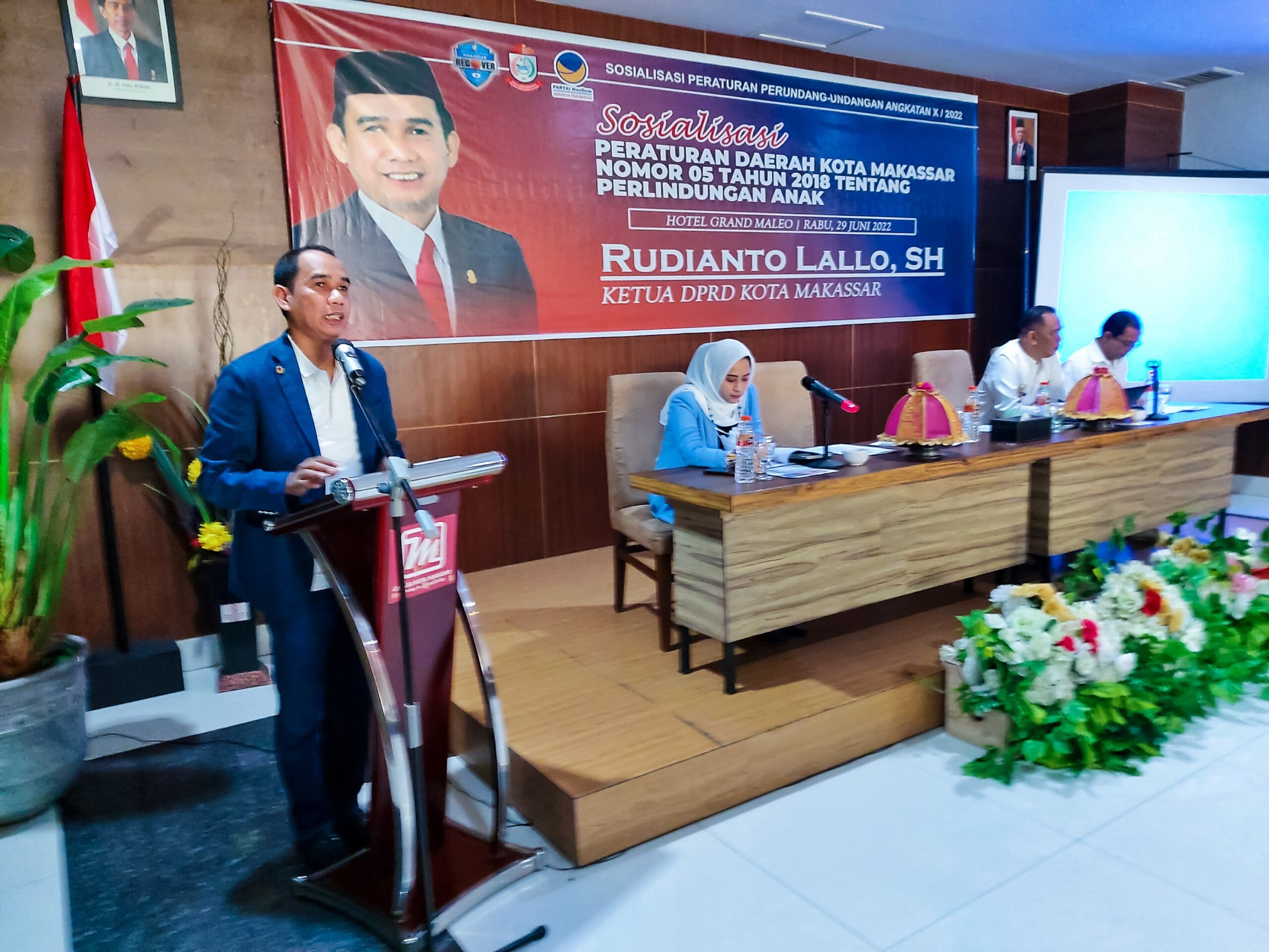MANIFESTO, MAKASSAR– Ketua DPRD Makassar Rudianto Lallo mengimbau kepada seluruh ibu-ibu utara Kota Makassar untuk menjaga anak dari tindakan kriminal ataupun eksploitasi. Hal ini disampaikam dalam sosialisasi peraturan daerah Kota Makassar nomor 5/2018 tentang perlindungan anak angkatan X/2022 di Hotel D Maleo Makassar, Rabu, 29/6/2022.