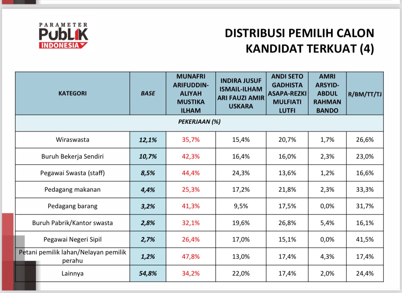 Selain ASN, Parameter Publik Indonesia juga mengukur kecenderungan kalangan wiraswasta, buruh bekerja sendiri, pegawai swasta (staf), pedagang makanan, pedagang barang, buruh pabrik/kantor swasta, hingga petani pemilik lahan/nelayan pemilik perahu. Seperti ASN, MULIA juga unggul di semua kalangan tersebut.