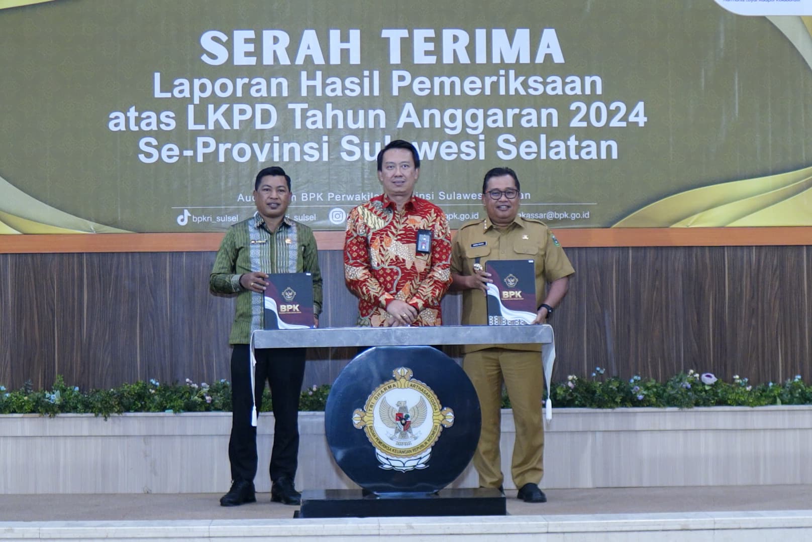 Penyerahan laporan hasil pemeriksaan atas Laporan Keuangan Pemerintah Daerah (LKPD) se-Sulawesi Selatan berlangsung di Auditorium BPK RI Perwakilan Sulsel, Jalan AP Pettarani, Selasa 27 Mei 2025.
