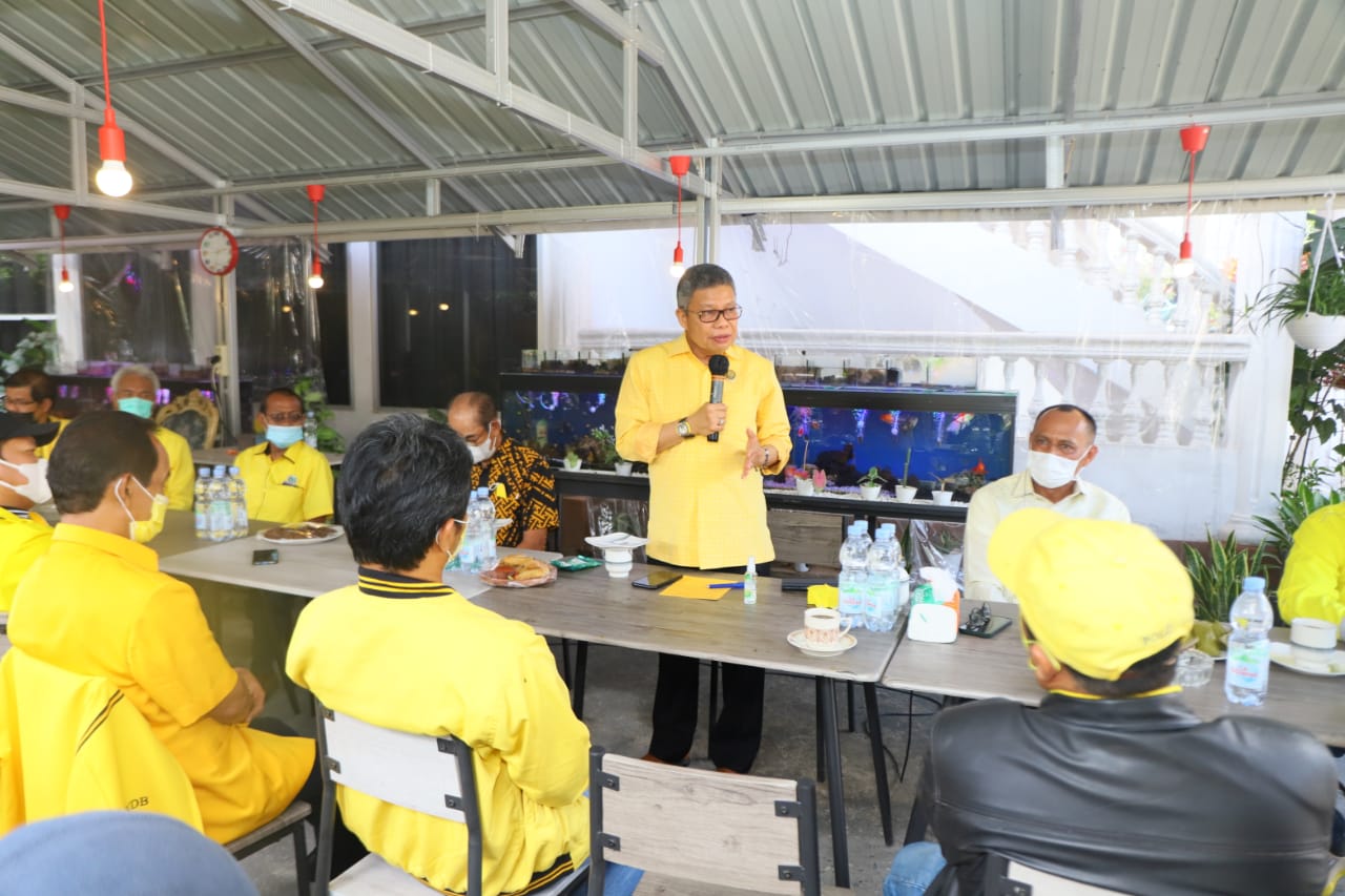 Taufan Pawe didampingi sejumlah elite Partai Golkar Sulsel. Diantaranya Sekretaris Andi Marzuki Wadeng, Ketua Bappilu La Kama Wiayaka, dan Wakil Ketua Kaderisasi Abbas Hady.