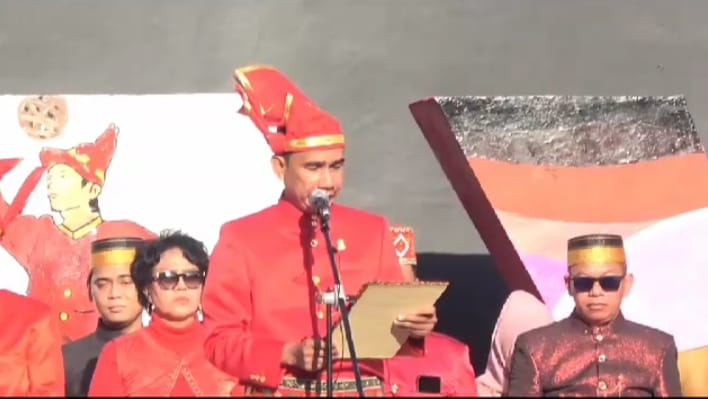 MANIFESTO, MAKASSAR – Ketua DPRD Kota Makassar, Rudianto Lallo, didaulat membacakan teks Proklamasi dalam Upacara Peringatan HUT RI ke-78 di Anjungan City of Makassar, Pantai Losari Kota Makassar, Kamis 17/8/2023.